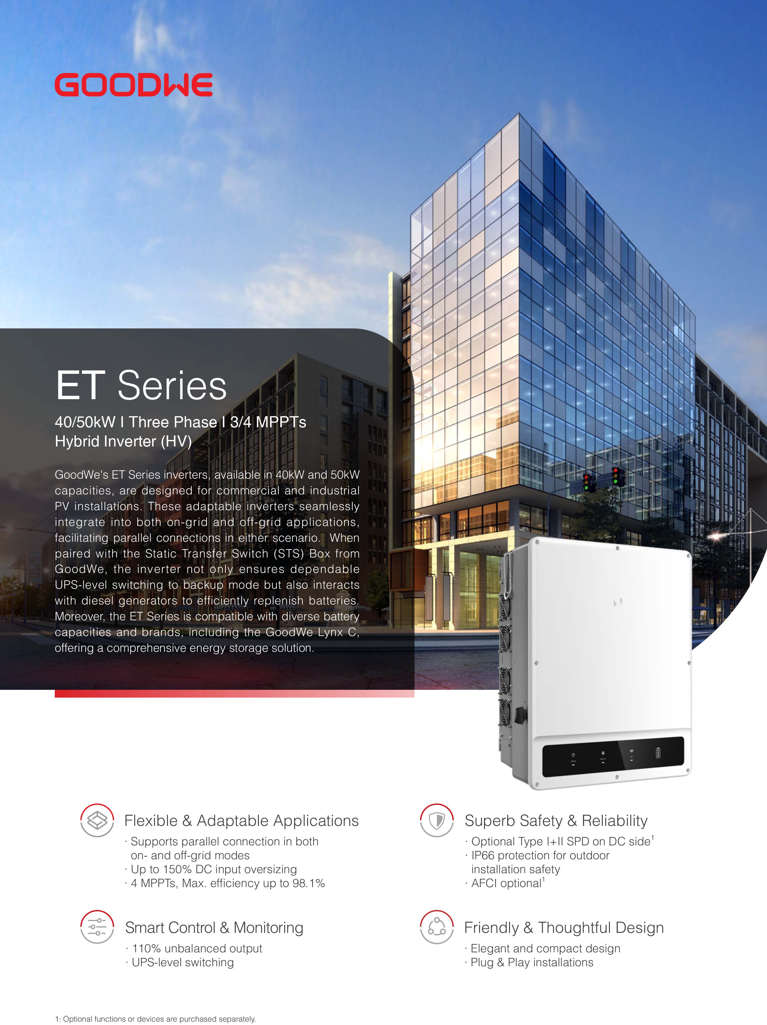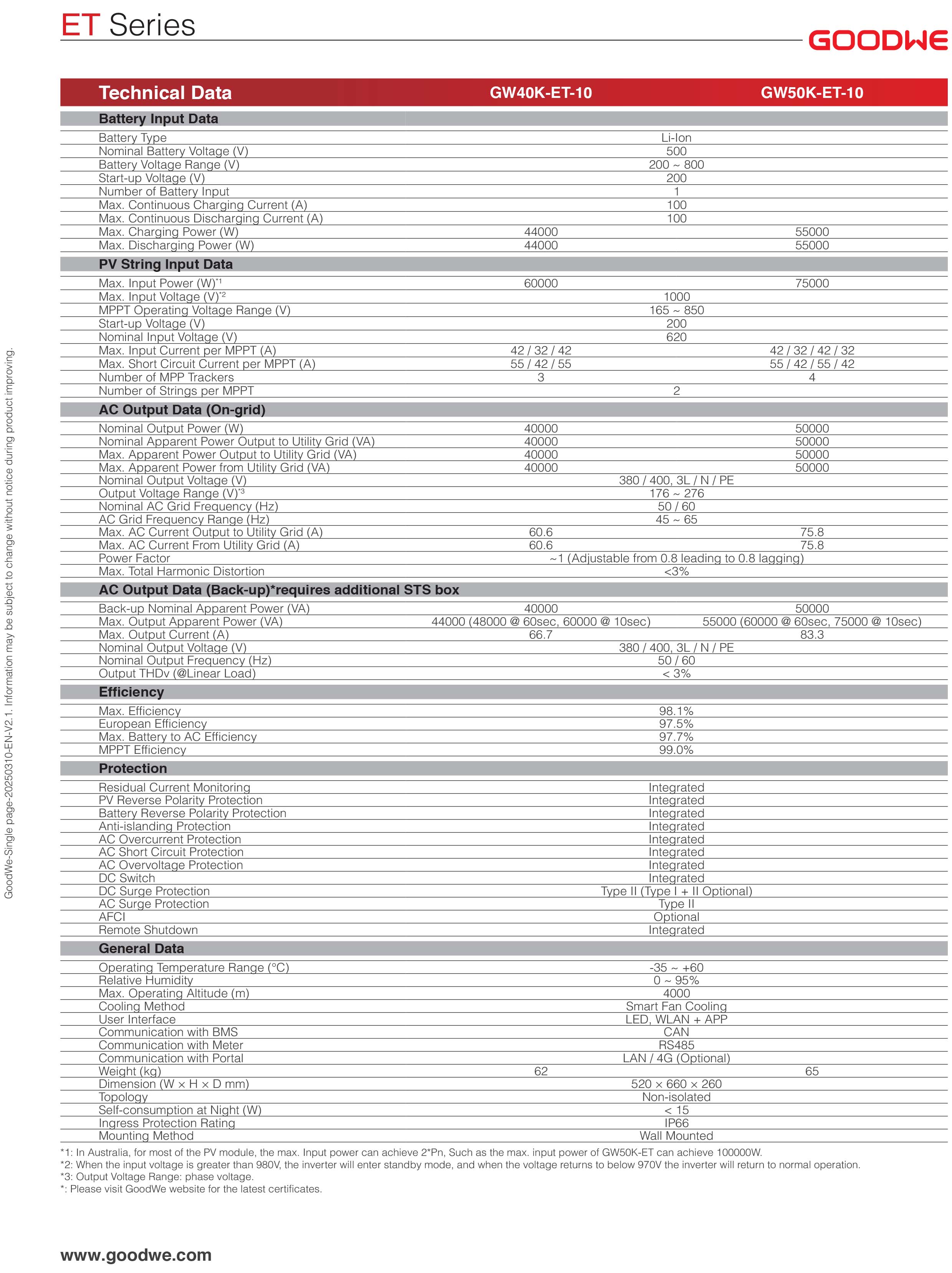 GoodWe GW50K-ET-10 – Biến tần hybrid 50kW 3 pha, IP66, SPD II, hỗ trợ hòa lưới & độc lập, AFCI tùy chọn, kết nối song song, hiệu suất cao, phù hợp dự án thương mại & công nghiệp.