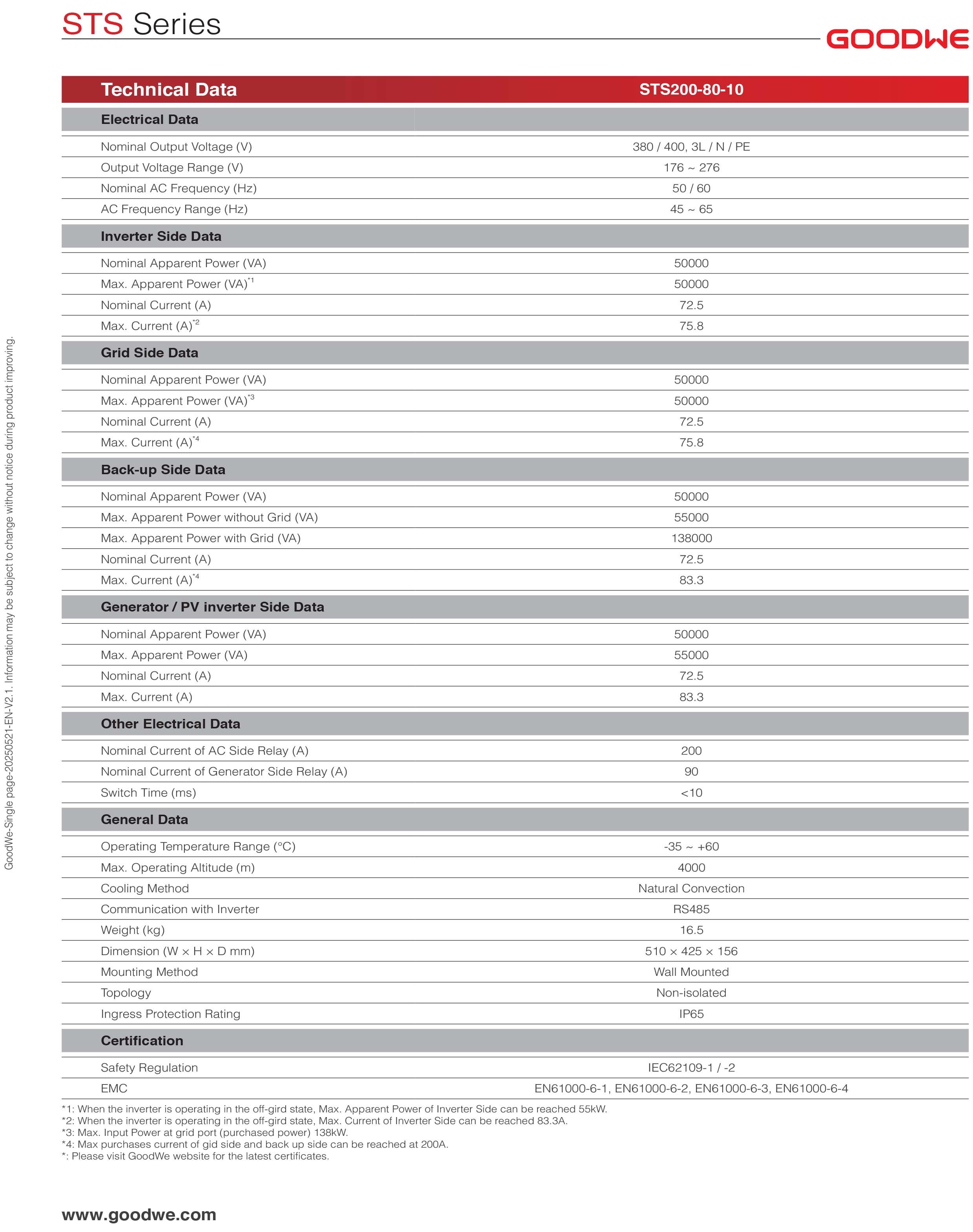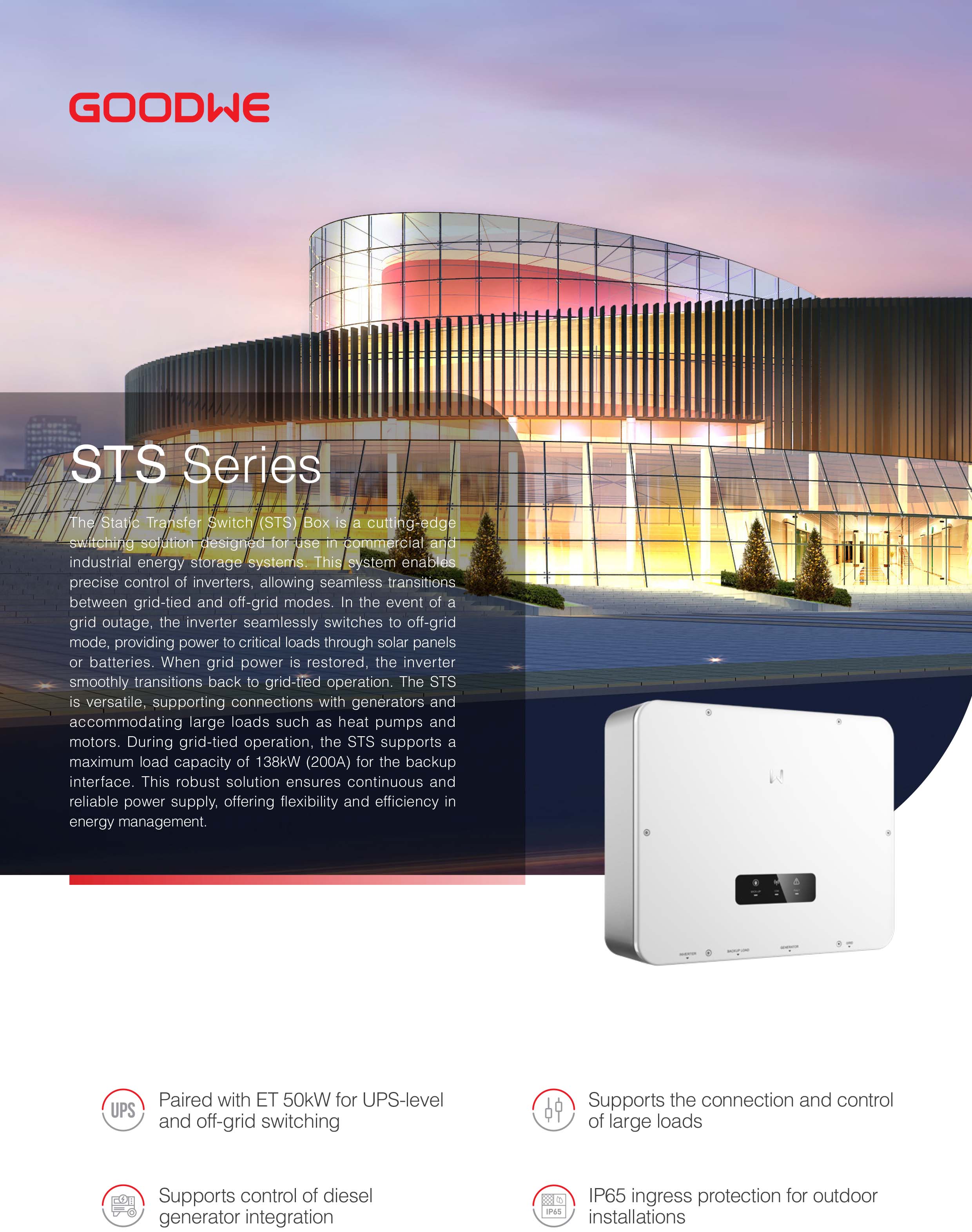 Bộ Chuyển Mạch Tĩnh GoodWe STS200-80-10 là giải pháp tiên tiến dành cho các hệ thống lưu trữ năng lượng thương mại và công nghiệp, đảm bảo nguồn điện liên tục – ổn định – an toàn cho các tải quan trọng.