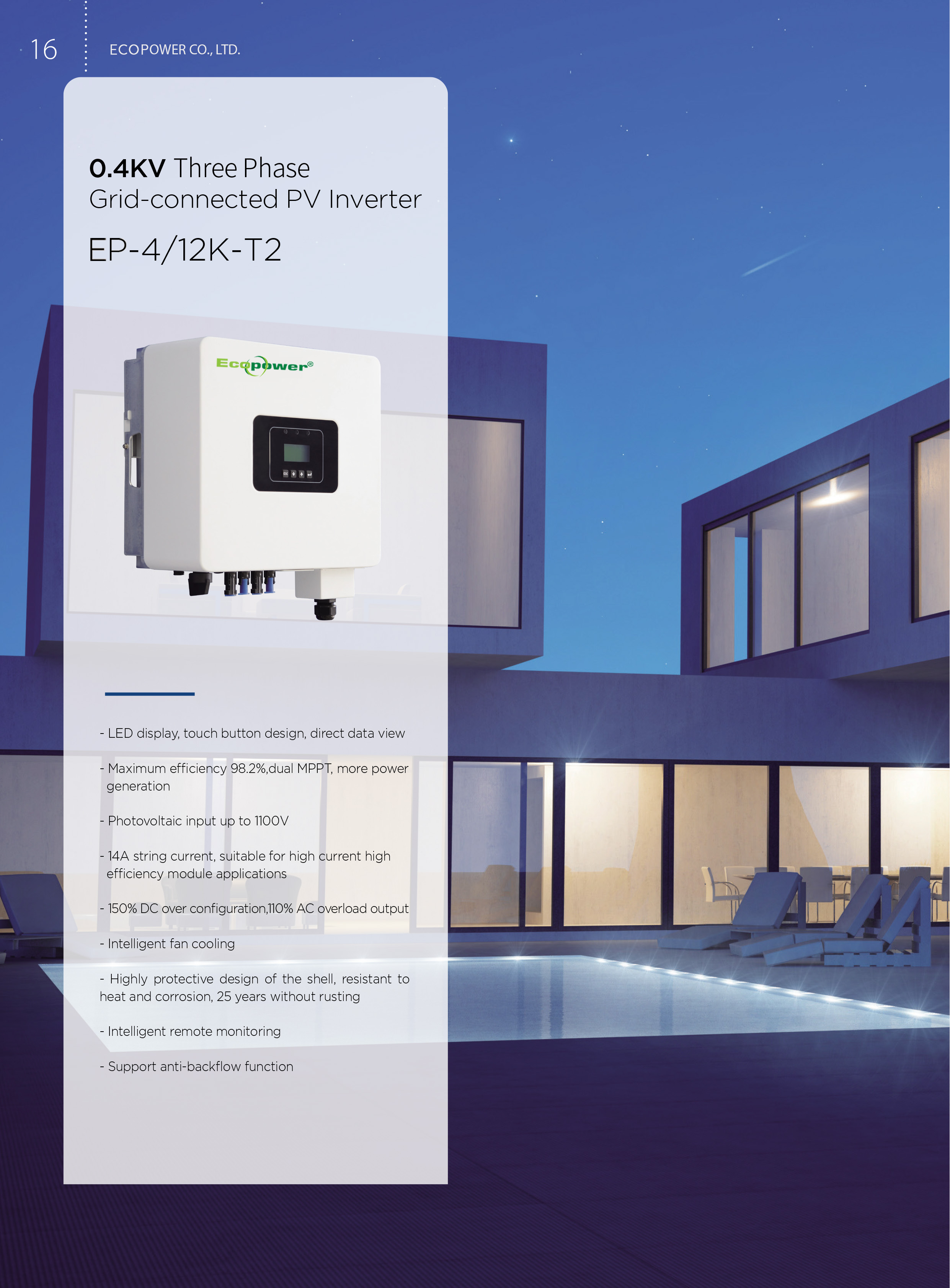Inverter Hòa Lưới Ecopower 12KW 3 pha (EP-12K-T2) là một sản phẩm tốt cho những người muốn sử dụng điện năng lượng mặt trời để cung cấp cho gia đình hoặc văn phòng làm việc của mình.