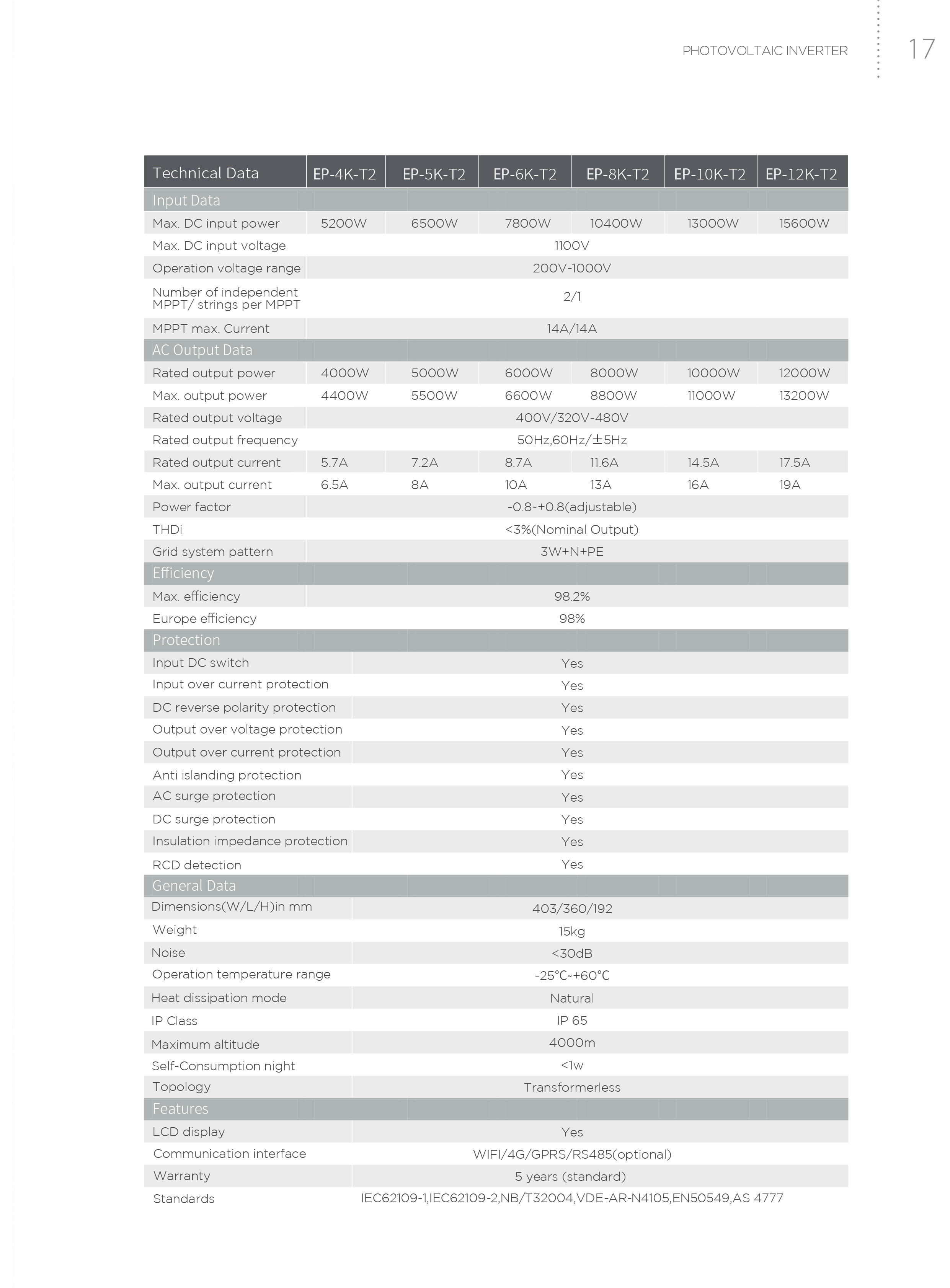 Inverter Hoà Lưới Ecopower 12KW 3 pha (EP-12K-T2) tương thích với các mô-đun công suất cao. Hiệu suất tối đa lên đến 98,2%, mang lại cho bạn năng suất cao hơn nhưng có kích thước nhỏ hơn và trọng lượng nhẹ hơn. Do đó, tiết kiệm chi phí nhân công và vận chuyển.