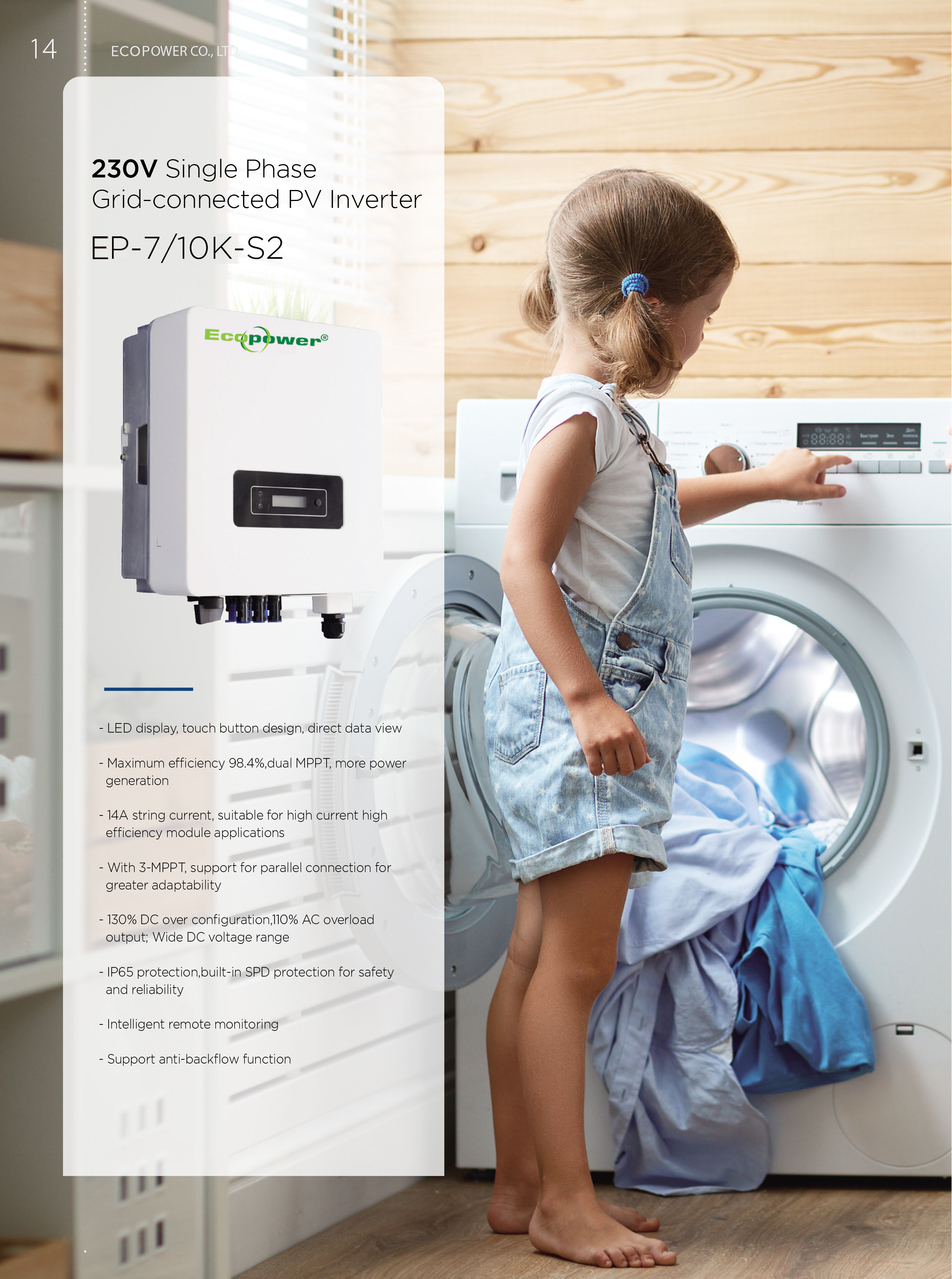 Inverter On grid Ecopower 10KW 1 pha (EP-10K-S2) là một sản phẩm tốt cho những người muốn sử dụng điện năng lượng mặt trời để cung cấp điện cho gia đình hoặc văn phòng làm việc của mình.